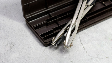 Compass technical drawing instrument that used for inscribing circles or arcs on paper - selective focus on pencil