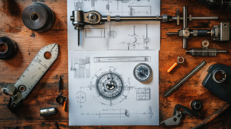 A collection of technical drawing tools and sketches displayed on a rustic wooden table, illustrating artistry and precision in engineering and design processes.