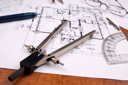 Photo of the Architectural project, pair of compasses, rulers and calculator