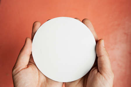 white empty circle for an inscription or in light-skinned hands on a pink background