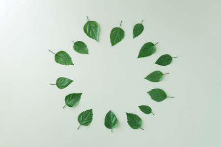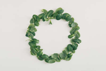 Round wreath made of fresh green leaves on a white background. Flat lay nautral concept. Framed copyspace.