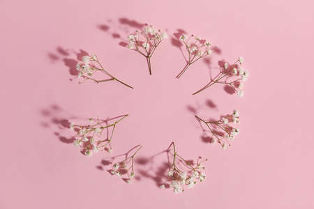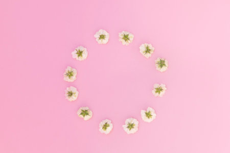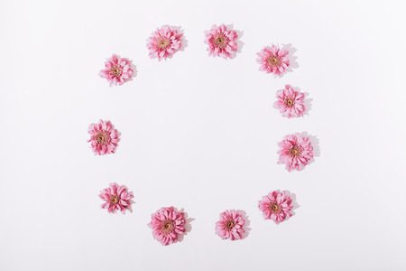 Pink flowers in the shape of a circle on a white background top view