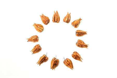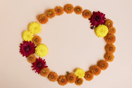 A circle made with dry flowers and leaves on a brown background in a top view