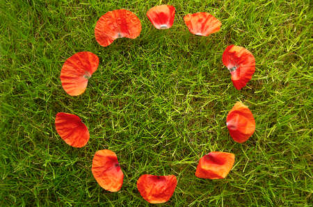 poppy petals on the grass in a circle. on the green grass of the lawn, the petals of poppies are spread out in a circle. copispace