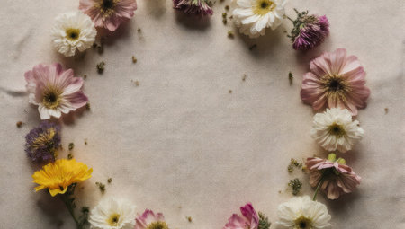 A beautiful circular frame made from a variety of fresh pink, white, and yellow flowers arranged on a soft, light-colored textured fabric background with copy space.