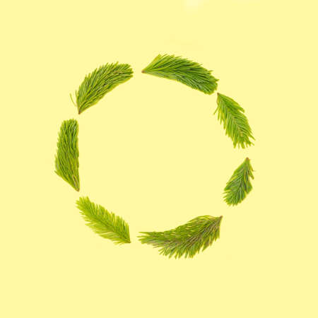 Lovely abstract circle made of natural fresh baby spruce. Minimal arrangement, creative copy space with pastel yellow background.