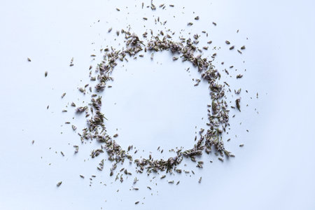 Dried lavender isolated on pink background arranged in circular motion. Spa and relaxation concept.