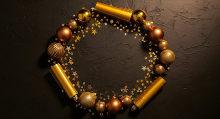 Festive circular frame of golden and bronze christmas ornaments, baubles, and sparkling star confetti on a dark background