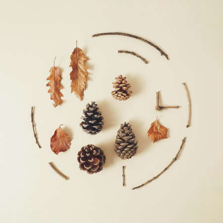Infographic design of autumn leaves, tree branches and pinecones on pastel cream. Creative fall background.