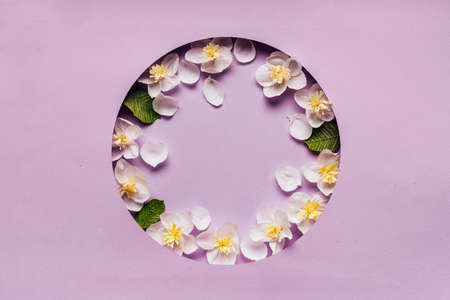 Circle frame. Natural blossom spring and summer concept. Blank for advertising card or invitation. Creative layout paper card. Mock up. DIY and handmade paper art