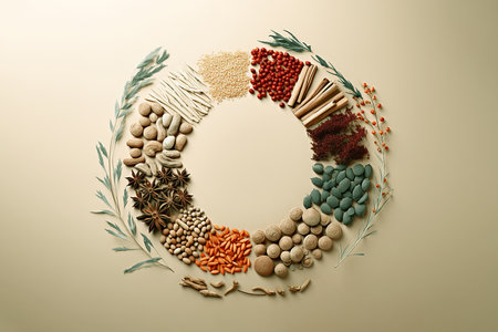 Generative AI Image of Variety of Traditional Herbal Medicines Arranged in Circle on Beige Background