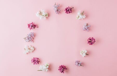 Floral purple frame pattern made of lilac flowers on pink background. Flat lay, top view. Minimal concept