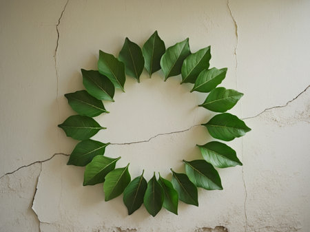 AI Generated. Bay leaves arranged in a circle on plaster wall background