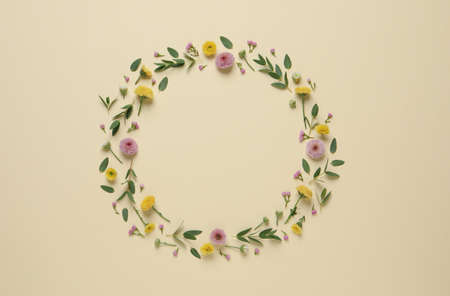Wreath made of beautiful flowers and green leaves on beige background, flat lay. Space for text
