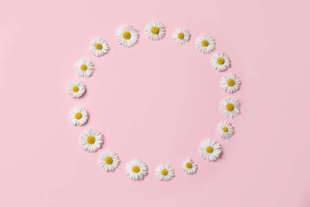 Frame of daisy flowers on pink background, flat lay. Space for text