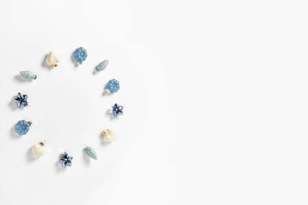 Christmas decor in the form of cones, hearts and stars in blue on a white background. minimalistic new year concept. flat lay, top view, copy space.