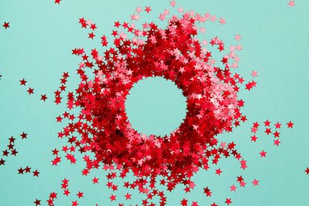 Confetti. Frame made of colored red star confetti front of blue background. Copy space