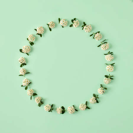 Creative circle layout made with white flowers. Nature flat lay. Summer round frame background