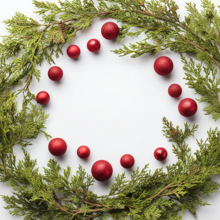 Festive arrangement of green foliage and red ornaments on a clean white background