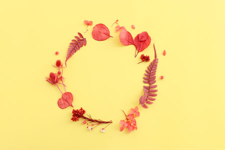 Top view image of autumn forest natural composition over yellow background .Flat lay