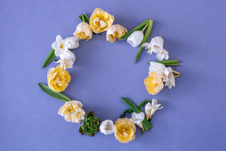 Floral composition in the form of a wreath of flowers on a blue background. Spring or summer layout of flowers with a copy of the space.