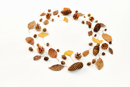 A top view of a wreath made of autumn leaves and conifer cones on white background
