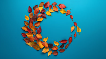 Colorful autumn leaves arranged in the shape of a wreath, creating a circular design with vibrant reds and oranges. The background is blurred to focus on the colorful leaves forming the circle. --chaos 30 --ar 16:9 --v 6.1 Job ID: 46559e15-7d52-4559-87e1-37454b2e3efb