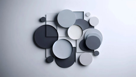 A collection of circular shapes in muted pastel colors like lavender, pink, and mint green are artfully scattered across a light beige surface
