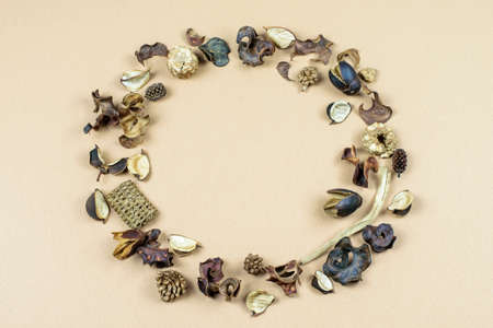 Dry vanilla flower wreath on the beige paper background. Flat lay photo of autumn mock up retro composition.