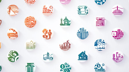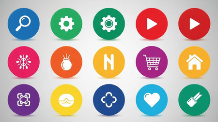 Various showing collection of colorful circular icons with various symbols on gray background. High resolution image suitable for commercial use.