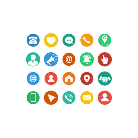 Set of communication icons flat. Phone, mobile phone, retro phone, location, mail and web site symbols on isolated background for applications, web, app. EPS 10 vector
