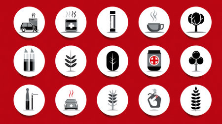 Icon set depicting the diverse health impacts of smoking, featuring various symbols against a bright red background to raise awareness.