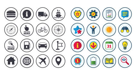 Set of Navigation and Gps icons. Windrose, Compass and Burger signs. Bicycle, Ship and Car symbols. Location pointer and flag. Calendar, Report and Book signs. Stars, Service and Download icons