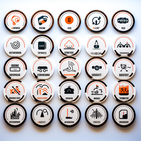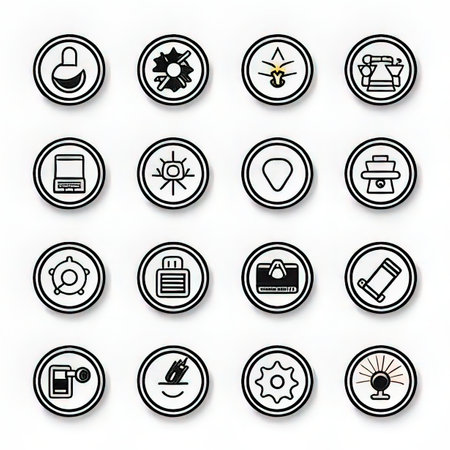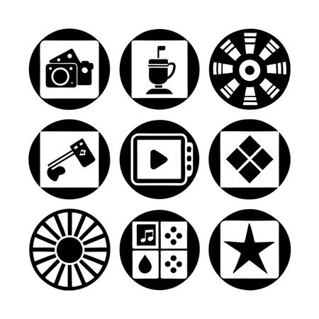 A grid of black circular icons featuring white symbols representing various functions like nature, signals, settings, play, and communication.