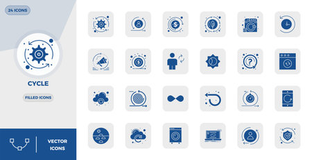 Essential pack of 24 PIXEL perfect vector icons for Cycle in Filled format, sized at 128x128 for optimal performance and scalability.