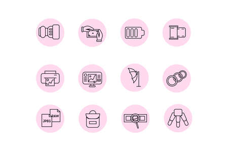Icons photographer. Photographer equipment icons set on a pink background. Softbox umbrella, film, film with a magnifying glass, lens, focus, battery with a charge level