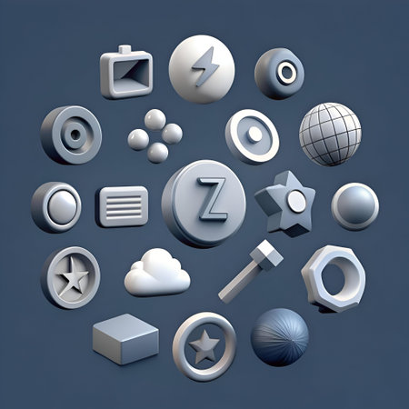 A collection of 3D icons in grey. floating against a blue background. Perfect for representing concepts of technology. social media. and the future.