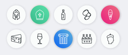 Set line Ancient column Ice cream in waffle Cheese Bottles of wine Olives French man and Wine glass icon. Vector.