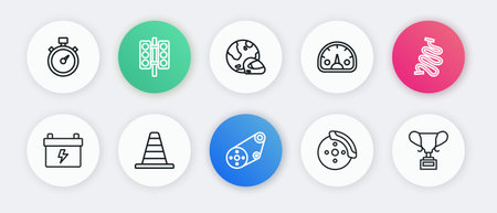 Set line Timing belt kit Racing track Car battery brake disk with caliper Speedometer helmet Award cup and Traffic cone icon. Vector.
