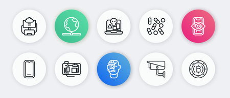 Set line Smart glasses on spectacles Computer vision Mobile phone Security camera Medical pill biohacking Internet piracy Cryptocurrency coin Bitcoin and Motherboard icon. Vector.