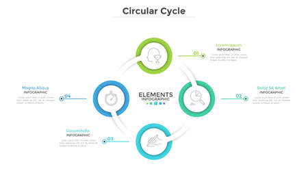 Ring-like diagram with 4 round paper white elements. Concept of cyclical business process with four steps. Clean infographic design template. Modern vector illustration for presentation.