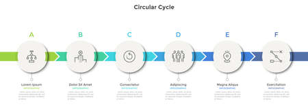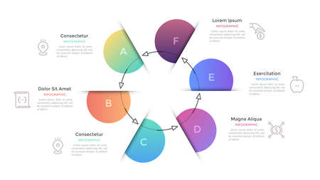 Six multicolored circles connected with main round element in center, 6 features of business process concept. Minimalist infographic design template. Vector illustration for presentation, website.