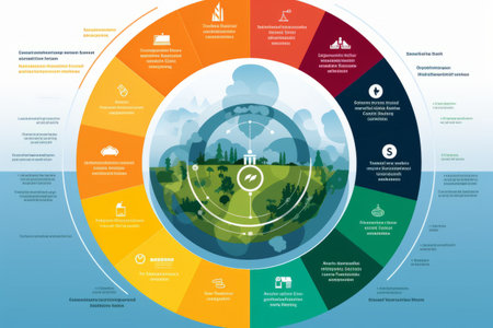 This illustrative image features a central globe surrounded by a ring of icons depicting ecological concepts. The artwork uses a clean style with a white background and subtle shading. The overall composition suggests environmental awareness and the interconnectedness of various sustainability initiatives. Suitable for diverse editorial and commercial applications.