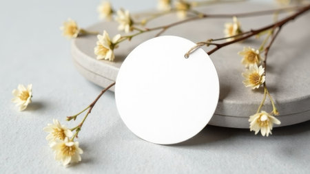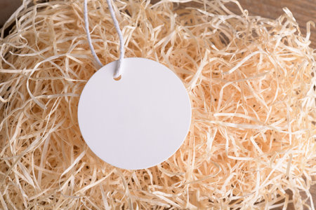 Round white tag mockup on a natural straw material for packing, close up. Label product mockup copy space for text and design natural. Zero waste, plastic free, eco friendly package