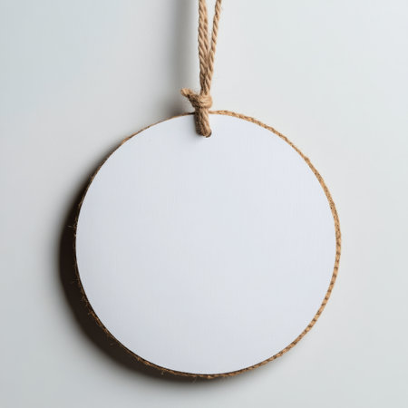 A circular, blank sign is suspended from a rope against a textured white wall. Ideal for personalizing with messages or designs, it is simple yet versatile for various settings.