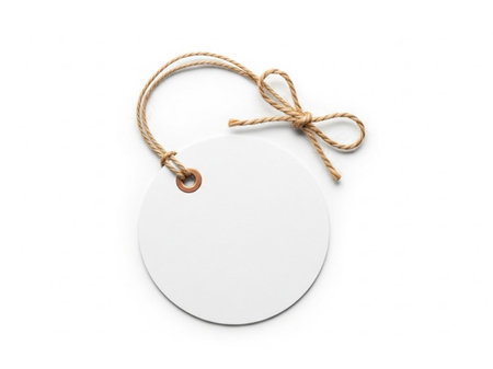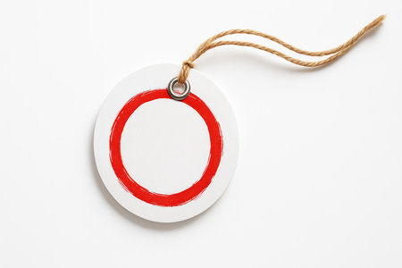 Round matte white price tag with red brush circle border nickel eyelet and natural jute twine trailing on white retail branding mockup