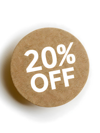 White '20% OFF' Text on a Light Brown Round Paper Note. White Background