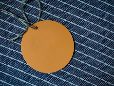 Circle shaped tag with space for text on beige fabric, closeup