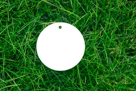 Top view of a frame made of green spring grass and one white cardboard round tag for sale with copy space. Natural concept