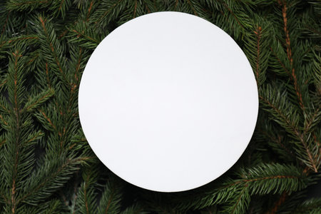 Blank card on spruce branches, top view with space for text. Christmas tree